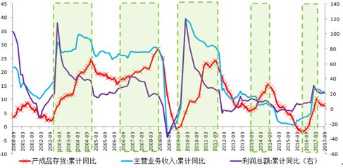 从2000 年以来,我国主要经历了5个主要的库存周期,每个周期时长35-40个月(基本符合基钦周期特点)。前3个库存周期处于经济上行时期或者经济高速增长时期,企业补库存阶段较长,而去库存阶段较短。自2011年以来是后两个周期,处于经济增长放缓时期,企业去库存阶段拉长,而补库存阶段缩短。从2016年下半年以来迎来了此轮库存周期的补库存阶段,但2017年三季度市场需求开始走弱,投资增速还会下降,之后可能进入新的去库存阶段。